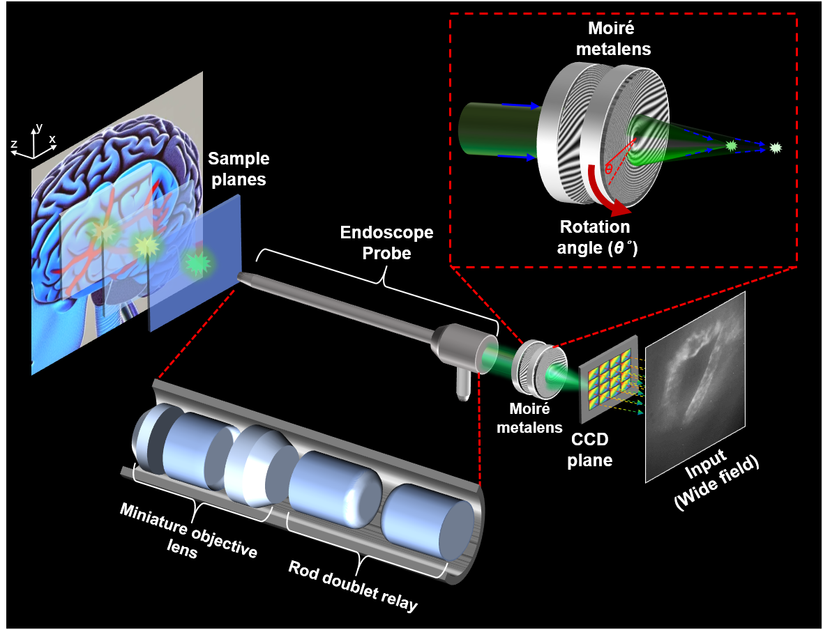 技術簡介 | 本團隊開發出以人工智慧為核心的可變焦超穎光學內視顯微系統,結合深度學習HiLo切片演算法、遠心設計與超穎透鏡,透過單張影像即時重建高對比光學切片圖,處理效率提升50倍。系統已成功應用於活體微血管成像,具備高解析與即時性,適用於神經成像和腦部手術等醫療應用。 |