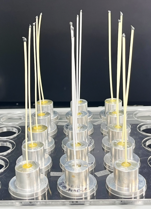 產業應用性 | 本團隊研究開發的高通量碳捕捉中空纖維膜,具備模組化、低能耗與高選擇性等特性,特別適用於燃煤電廠與重工業等高排碳場域。相較傳統平板膜模組,其高填充密度與穩定操作特性可顯著降低設施體積與成本,提升系統效能與導入彈性,為我國能源與製程產業實現淨零轉型提供關鍵技術支撐。 |